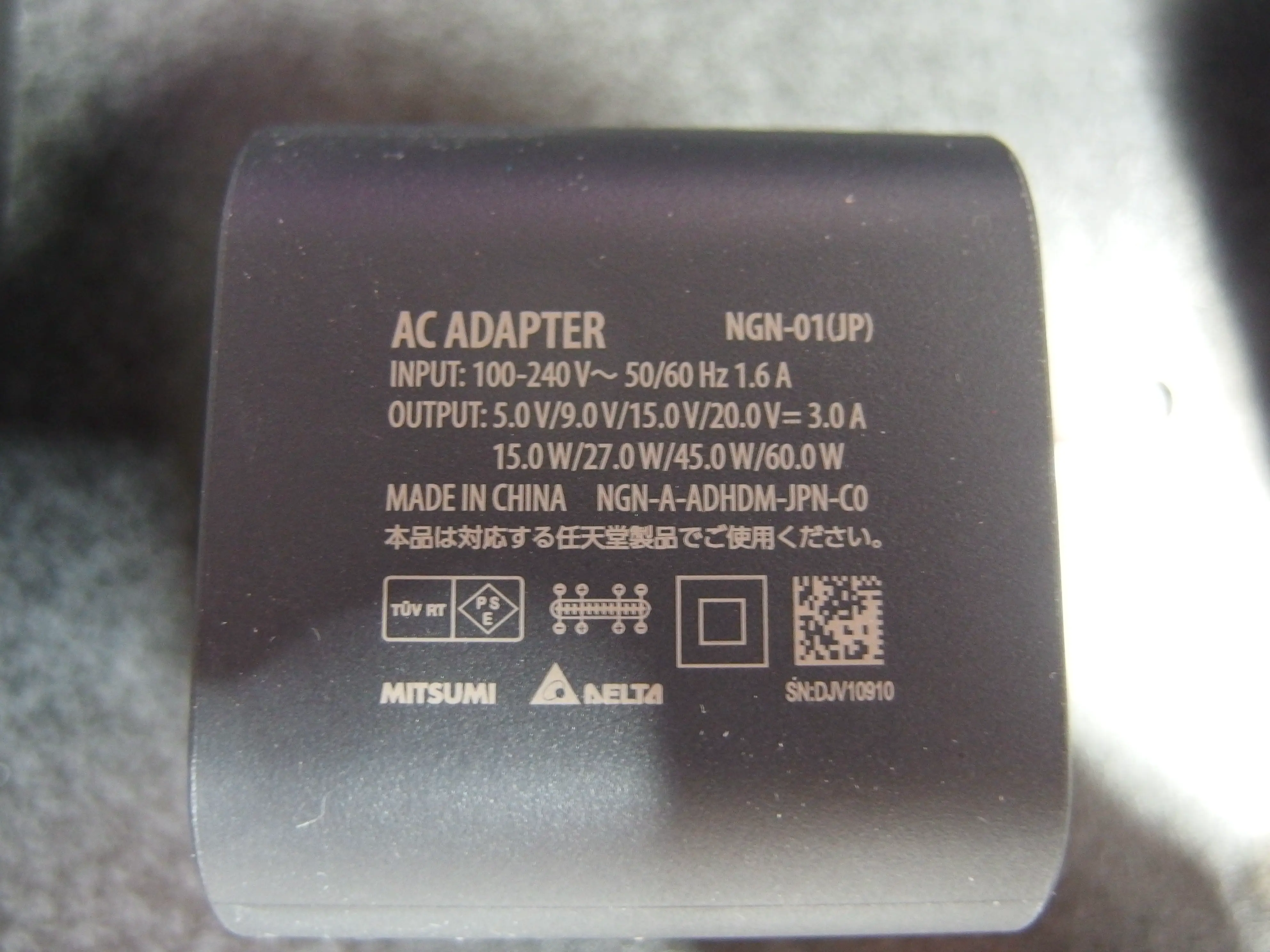 ACアダプターは60Wのようで、Switch1のアダプター(39W)では少し足りないようです。