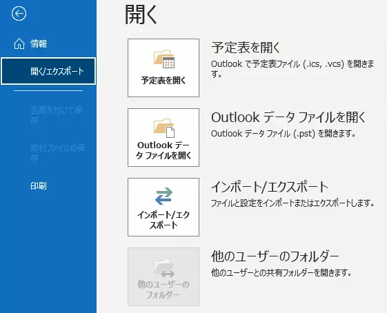 メニューの「ファイル」から「開く/エクスポート」を選択し、「インポート/エクスポート」を選択します。