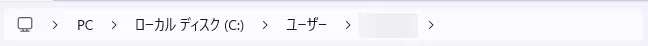 まず、ユーザーのフォルダを開きます。多くの人は、「PC」>「ローカルディスク(C:)」>「ユーザー」>ユーザー名を開くことになると思います。