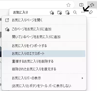 Microsoft Edgeを使っている人は、メニューバー右上の「お気に入り」ボタン(☆=)から、「その他オプション」ボタン(…)を選択。「お気に入りのエクスポート」があるので、それを選択しましょう。