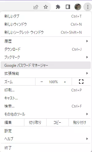 メニューバー右上の「Google Chromeの設定」から「パスワードマネージャー」を選択。