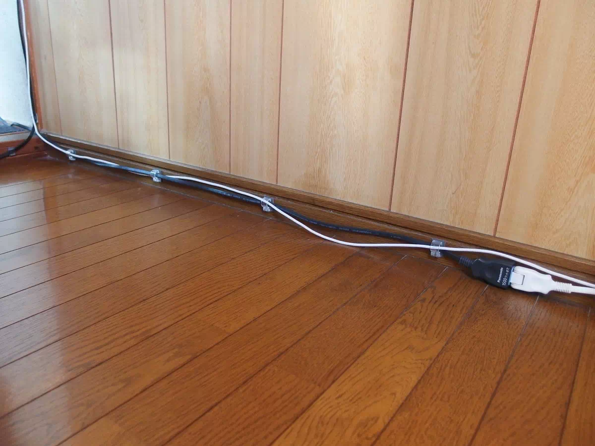 ついでに、自室から電源延長ケーブルも引かないといけなかったので、下も同様に配線が通るようにしています。