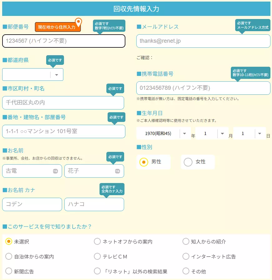 まずは上図のパソコン台数と回収日を入力して、「回収先情報を入力する」をクリックします。