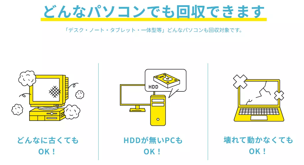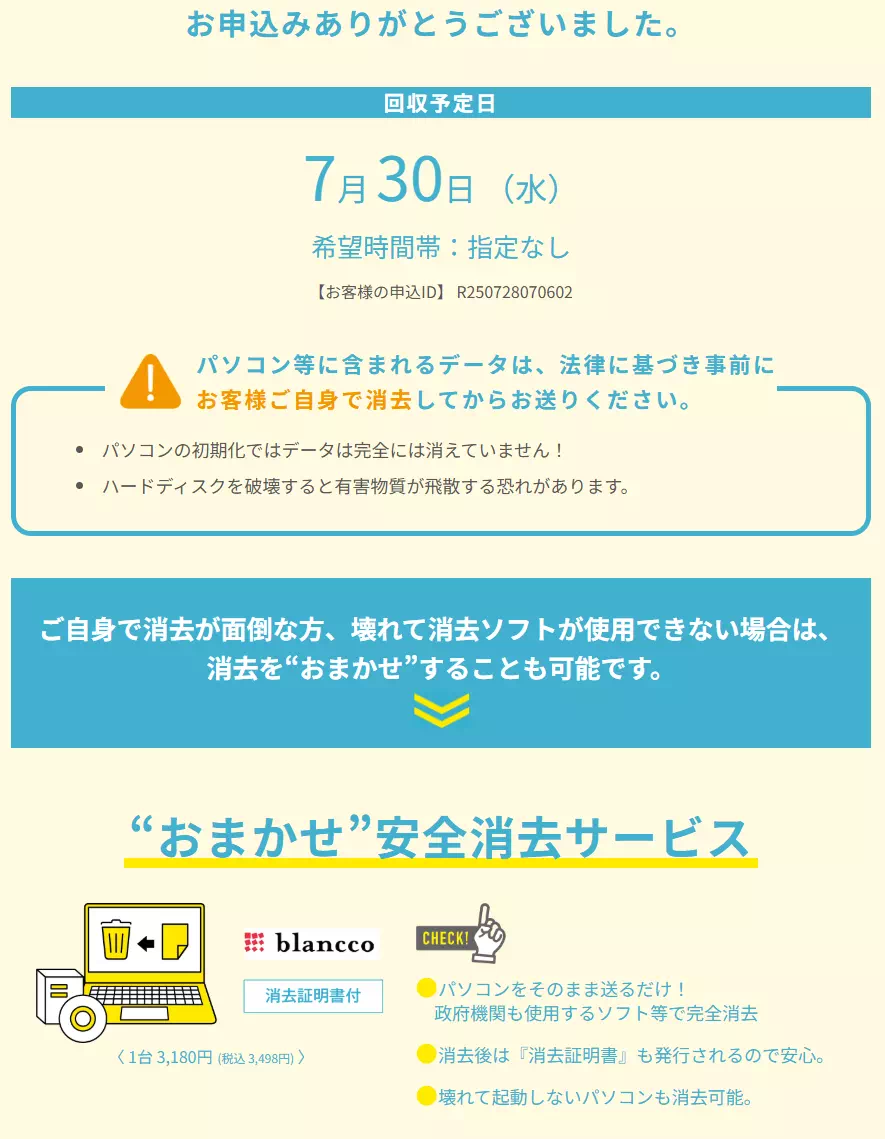 おまかせ安全データ消去サービスがあるようなのですが、1台3500円くらいかかります。