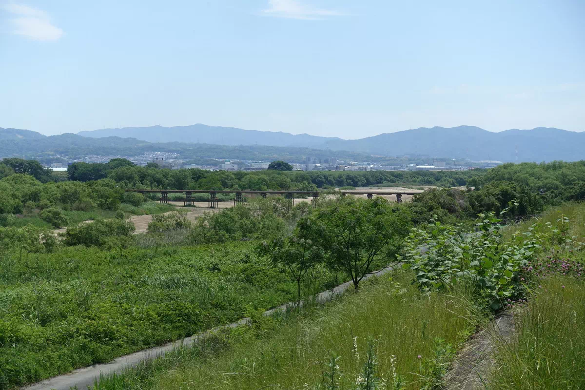 さくらであい館から木津川沿いに進むと、流れ橋(上津屋橋)があります。