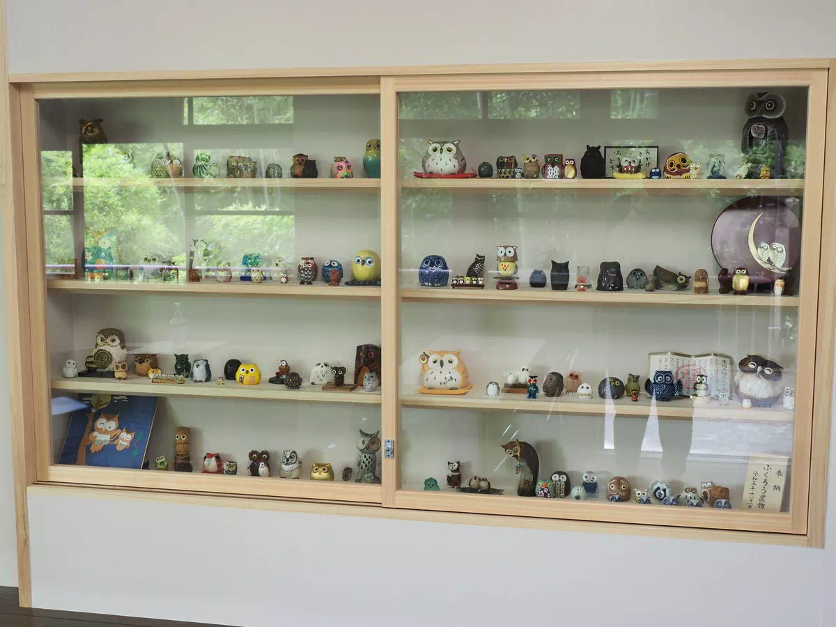参道横に参拝者の休憩所があったのですが、そこにはふくろうの置物がたくさん飾られていました。