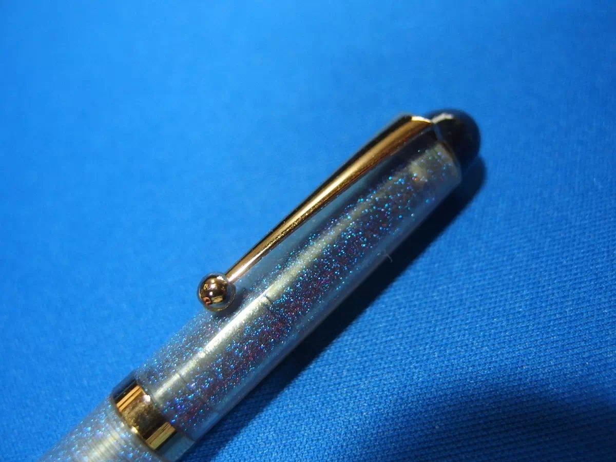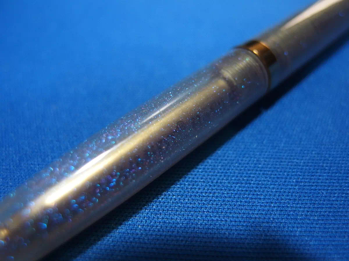 透明な軸にブルーのラメが入っています。